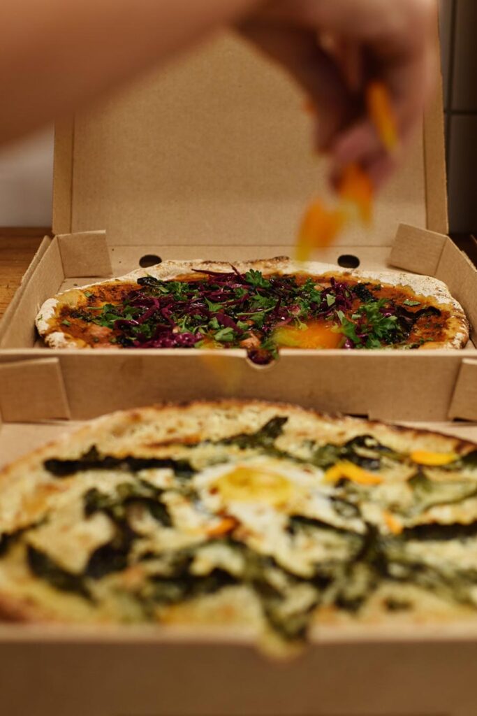 Pizzorna bakas på surdeg med kulturspannmål i en stenugn.